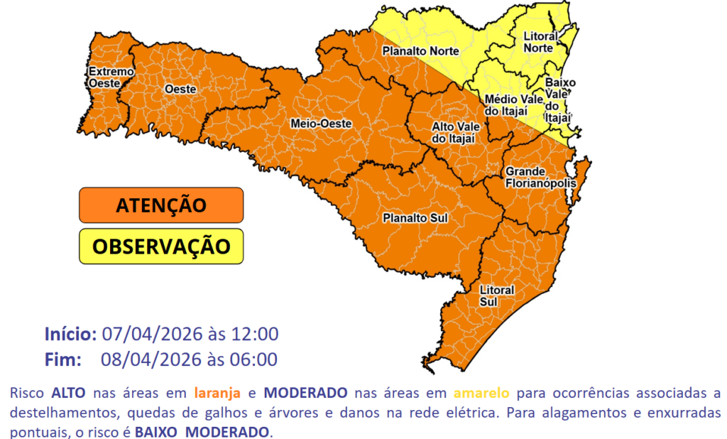 A passagem de uma frente fria por SC, a partir da tarde desta terça-feira (07) e durante a madrugada de quarta-feira (08), favorece a formação de temporais, alguns potencialmente severos, por todas as regiões do estado, especialmente nas áreas próximas ao RS, oferecendo risco MODERADO a ALTO para ocorrências relacionadas à destelhamentos, danos na rede elétrica e queda de galhos e árvores, além de alagamentos e enxurradas pontuais. Os temporais ocorrem acompanhados de raios, chuva pontualmente intensa e principalmente, fortes rajadas de vento (acima dos 70-80 km/h). A condição para granizo é menor.