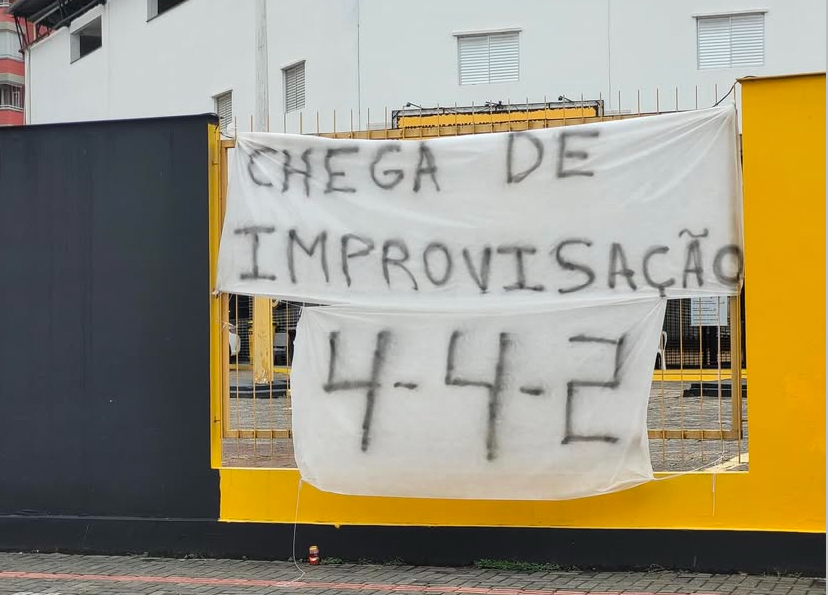 Na manhã deste sábado, o Estádio Heriberto Hülse amanheceu com manifestações de torcedores do Criciúma. Faixas foram penduradas no local com críticas ao desempenho recente da equipe e pedidos por alterações no modelo de jogo adotado por Eduardo Baptista. Expressões como “Chega de improvisação”, “4-4-2” e “A cidade é pequena” chamaram atenção.