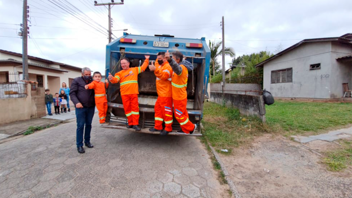 Para marcar ainda mais este dia, uma equipe de coletores da Prefeitura Municipal foi até a casa do pequeno Augusto com um caminhão compactador para a alegria dele e de seus amiguinhos.