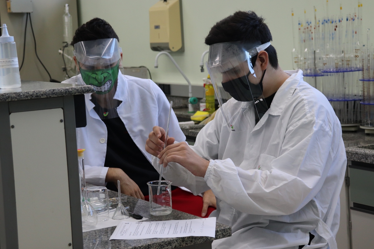 O Laboratório de Química da Universidade foi especialmente preparado para uma aula especial. Soluções, equipamentos e um desafio esperavam pelos estudantes da 2ª série do Ensino Médio do Colégio Unesc: produzir álcool 70%. Além de vivenciar toda uma experiência de aprendizagem, a manhã desta quinta-feira (11/3) também marcou o reencontro destes alunos com as aulas práticas em laboratório, paralisadas em março de 2020 por decorrência da pandemia.