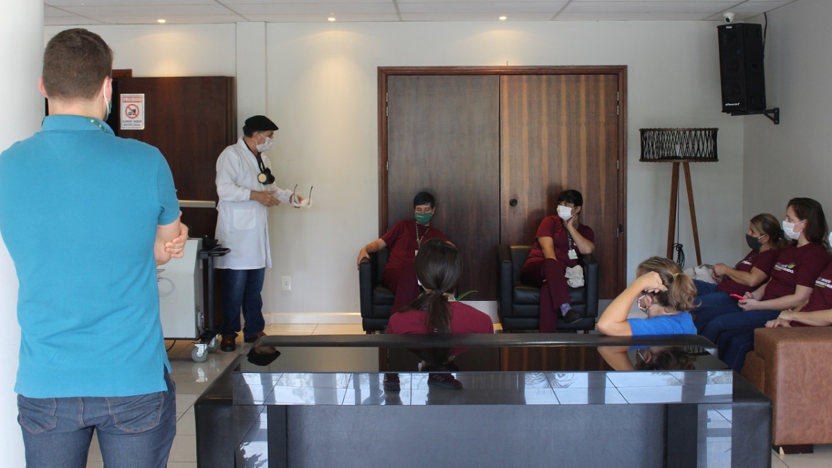 Os colaboradores da Unesc estão sendo capacitados para uso do ozônio na higienização do campus. O primeiro treinamento ocorreu na manhã desta terça-feira (28/4), ministrado pelo professor e pesquisador responsável do projeto, Elídio Angioletto, e mais momentos podem ser promovidos de acordo com a necessidade. 15 funcionários da Instituição, representantes do Sesmt (Serviço de Segurança do Trabalho), Apoio Logístico e Clínicas Integradas, estiveram presentes.