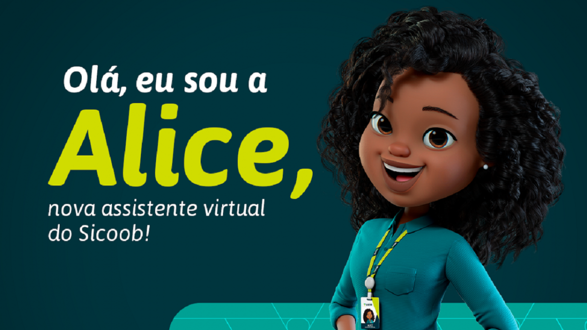 Nascida a partir do Programa de Transformação Digital do Sicoob, a Alice é a inteligência artificial inovadora que oferece um canal de atendimento totalmente virtual, ágil e eficiente, via App Sicoob. Ela ganhou um rosto e agora é representada por uma simpática figura feminina, de cabelo cacheado e sorriso amplo, vestindo uma das cores que representam o Sicoob, o verde turquesa.