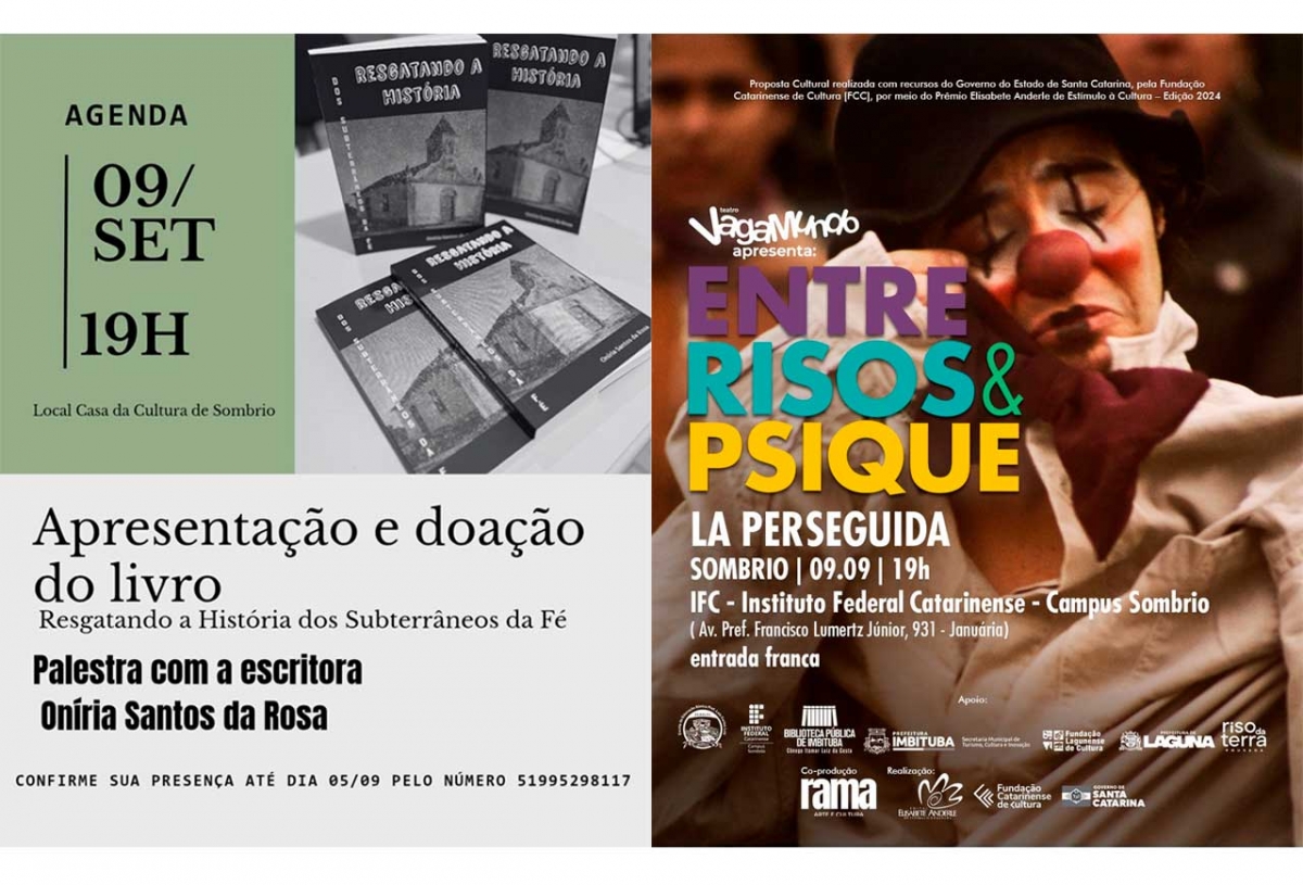 A prefeita Gislaine Cunha destacou que a coincidência dos dois eventos valoriza a diversidade da programação cultural no município. “Teremos, no mesmo dia, um lançamento literário com olhar sobre a nossa história e um espetáculo que aborda a saúde mental de forma criativa. Isso mostra como Sombrio se abre para diferentes expressões culturais, tanto as que resgatam a memória local quanto as que chegam de fora e dialogam com nossa comunidade”, afirmou.