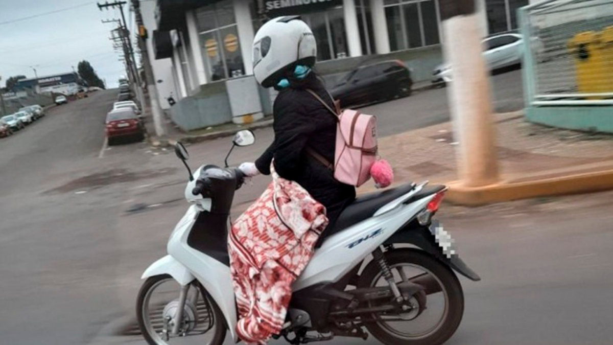 A mulher, que não foi identificada, pilotava a moto na avenida Fernando Machado, no bairro Bela Vista. Ela estava com as pernas cobertas por um cobertor rosa enquanto pilotava uma Honda/Biz segurando o guidão com apenas uma mão. Na imagem também é possível ver que a mulher está de luva.