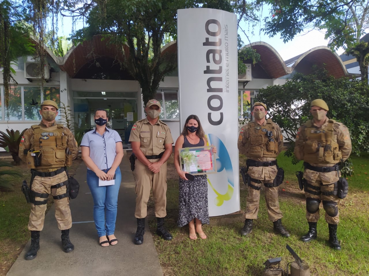 Na quarta-feira, dia 10, policiais do Batalhão levaram uma placa de reconhecimento da participação da Contato nessa mobilização, e foram recebidos pela proprietária, Marlise de Souza Pereira, e pela gerente do setor financeiro, Jaira Mateus Feliciano.