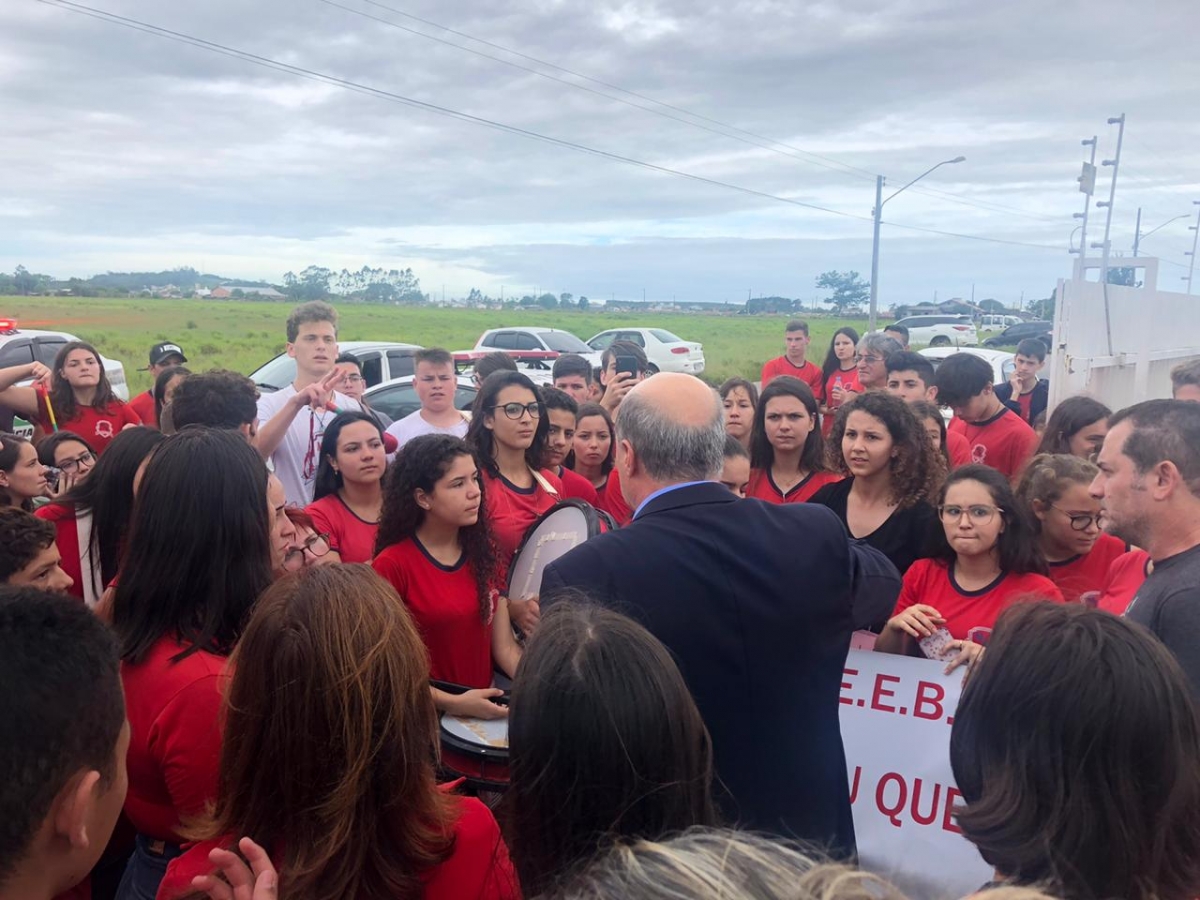Em meio ao anúncio das obras, diversos estudantes da Escola Professora Maria Garcia Pessi estiveram em frente à sede da AMESC, onde aconteceu a acolhida do governador. De acordo com estudantes que idealizaram o momento, eles foram informados que a entrada estava proibida. “Eles falaram que adolescentes não estavam autorizados a entrar, ainda mais uniformizado. Educação não funciona sem estrutura, precisamos de melhorias em nossa escola”, pontuaram.