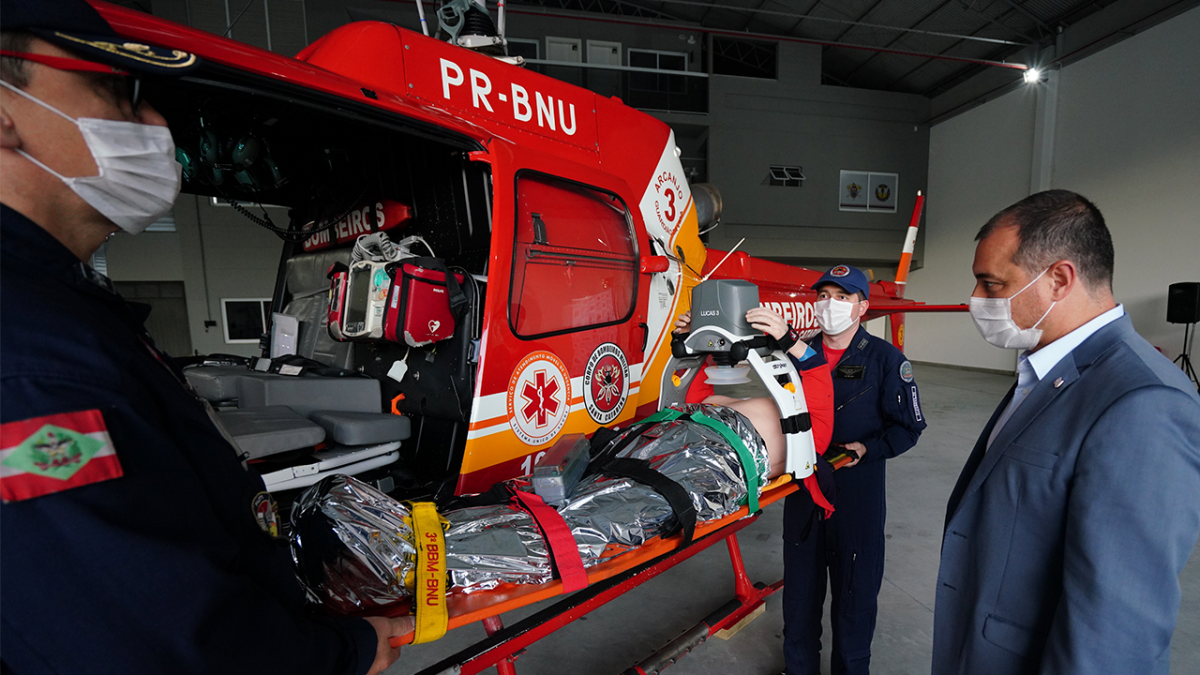 Durante a visita, Carlos Moisés acompanhou a explicação técnica sobre os novos equipamentos, conduzida pelo comandante do Batalhão de Operações Aéreas do Corpo de Bombeiros Militar e Samu, tenente-coronel Sandro Fonseca. Entre os itens, está um compressor torácico automatizado, no modelo Lucas 03, que realiza compressões para ressuscitação cardiopulmonar, atuando como um socorrista adicional, trazendo maior autonomia para as equipes de saúde trabalharem. O BOA é uma das primeiras unidades aéreas a ter este equipamento nas aeronaves e foi o primeiro a adquirir este modelo no Brasil. "Este equipamento facilita o trabalho da equipe médica e amplia as chances de sobrevivência em um paciente em parada respiratória", exemplifica o militar.