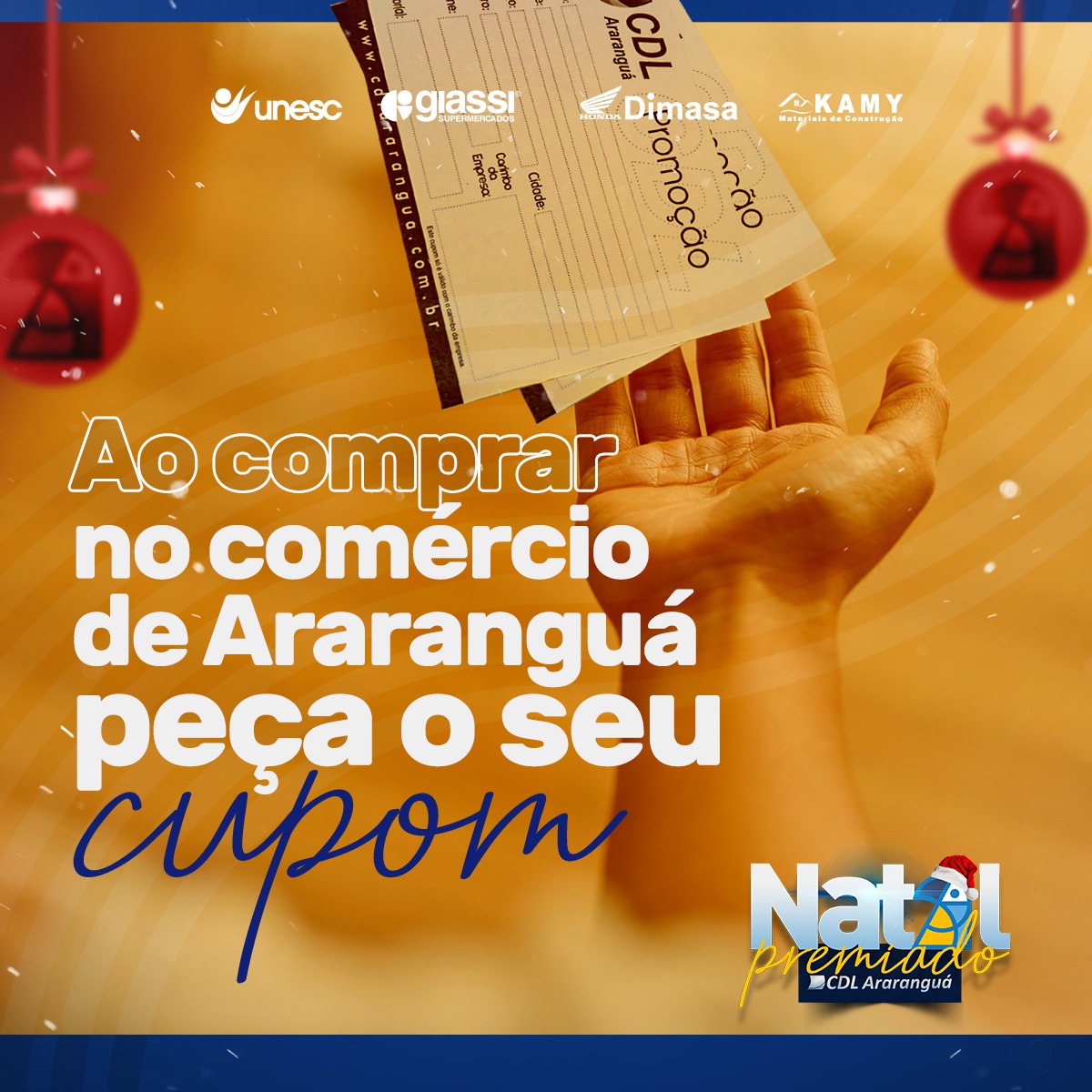 Faça suas compras no comércio de Araranguá e concorra a mais de R$ 100 mil em prêmios. São 05 motos Honda CG 160, 21 bicicletas top de linha e dezenas de vales-compras. Mas não esqueça, exija seu cupom.