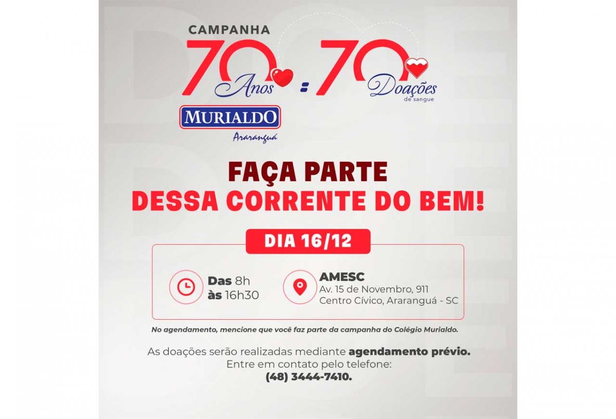 Em celebração aos 70 anos do Colégio Murialdo, realizamos a campanha “70 Anos = 70 Doações de Sangue” — um gesto solidário que expressa nossos valores de acolhimento, amor e compromisso com o bem comum.