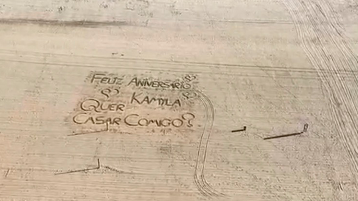Com a ajuda de um amigo, o namorado de Kamyla acordou de madrugada para fazer o pedido no dia do aniversário da amada. Ele escreveu na areia da paraia Central: “Feliz aniversário Kamyla, quer casar comigo?”.