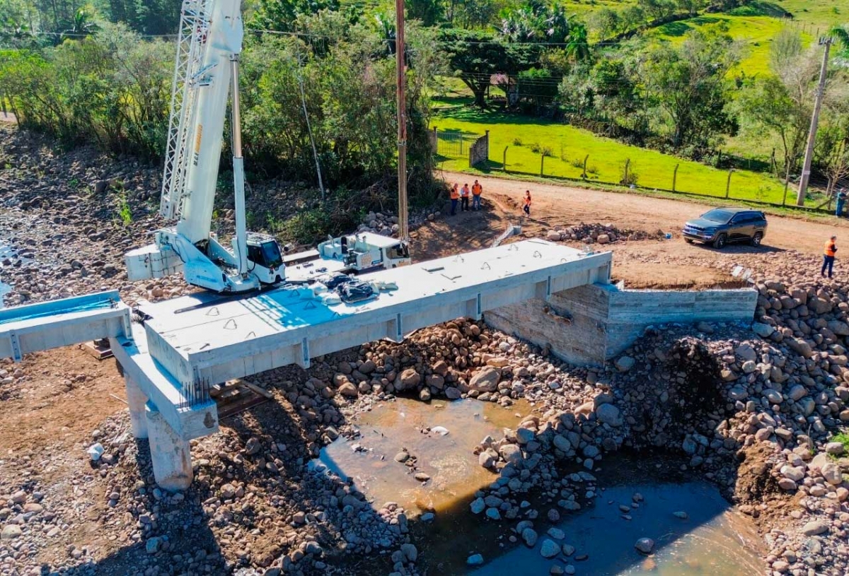 A nova ponte foi viabilizada com o uso de um Kit de Transposição de Concreto, estrutura desenvolvida pelo Estado para atender, de forma rápida e segura, regiões afetadas por desastres naturais. Esses kits são utilizados em substituição a pontes danificadas por chuvas intensas, oferecendo uma solução mais durável e resistente.