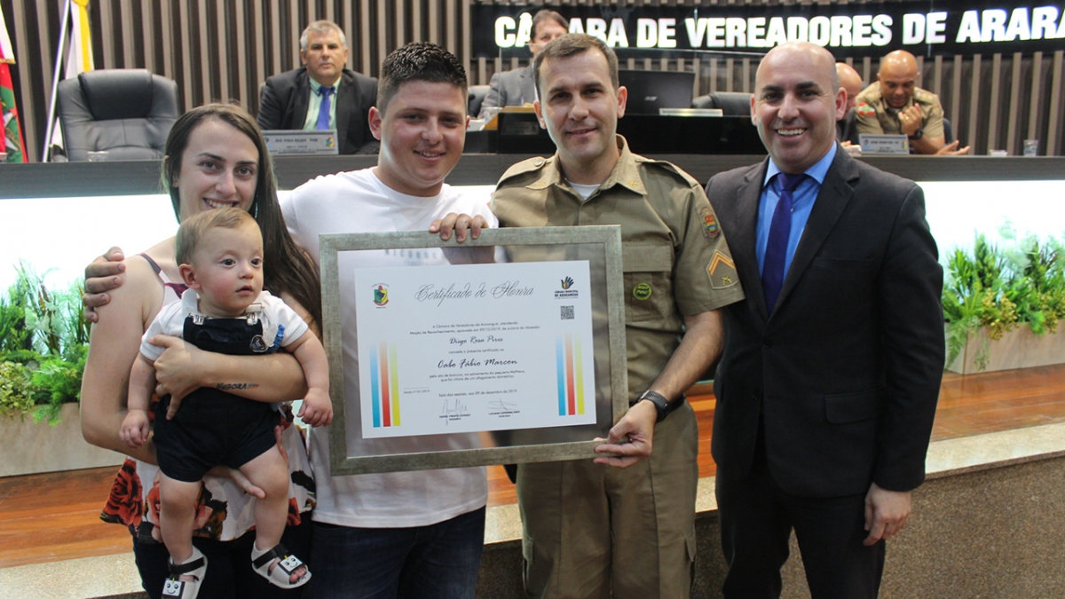 “No dia 24 de novembro quando o Cabo Fábio Marcon e o Soldado Daniel Pereira Pedrozo ajudaram a manter vivo o bebê Matheus que foi vítima de afogamento doméstico. O fato foi registrado no bairro Coloninha, em Araranguá, quando em momento de desespero os pais do bebê ligaram para a Central de Emergência da PM, no número 190, que imediatamente deslocou as viaturas para ajudar a família. As guarnições estavam em ronda para atender uma ocorrência de roubo, mas o Copon deu prioridade ao atendimento ao bebê Matheus, fato que fez com que os policiais fossem até o local. O cabo Fabio Marcon chegou primeiro, diante do desespero dos pais, pegou a criança no colo fez a manobra que é um procedimento recomendado para desafogá-lo. Em seguida chegou outra guarnição com soldado Daniel Pereira Pedrozo. Os pais do bebê não possuem carro, então os policiais levaram na viatura até o hospital. O soldado Daniel Pereira Pedrozo, ligou para Copom para avisar ao hospital para dar prioridade ao atendimento por conta da gravidade, mas graças a agilidade no socorro durante o deslocamento a criança já apresentava sinais de melhora. O pequeno Matheus e seus pais são verdadeiros exemplos de família, perseverança e amor. Desde seu nascimento prematuro, os obstáculos enfrentados por conta da saúde foram muitos. Matheus já ficou, inclusive, internado na UTI para reabilitação. Este susto mostra a fragilidade de um bebê e a necessidade de zelarmos cada vez mais pelas crianças de nossa sociedade em todos os aspectos e agradecermos a sensibilidade dos policiais, homens da segurança pública que entenderam a complexidade da situação”