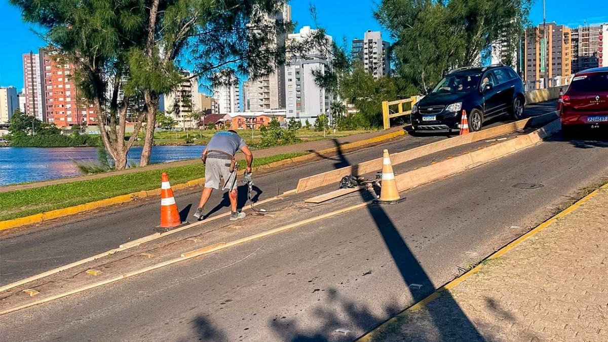 A Ponte Anita Garibaldi, que liga Passo de Torres (SC) a Torres (RS), recebe obras para impedir a passagem de caminhões.