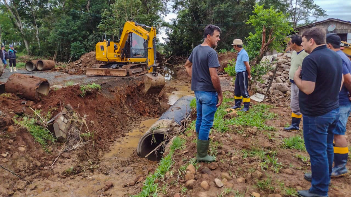 Neste domingo, o vice-prefeito Rodrigo Mariani e o secretário de Obras Celso da Silva foram às ruas para acompanhar as equipes das secretarias de Obras e Agricultura, visando a restauração dos acessos de todas as comunidades atingidas.