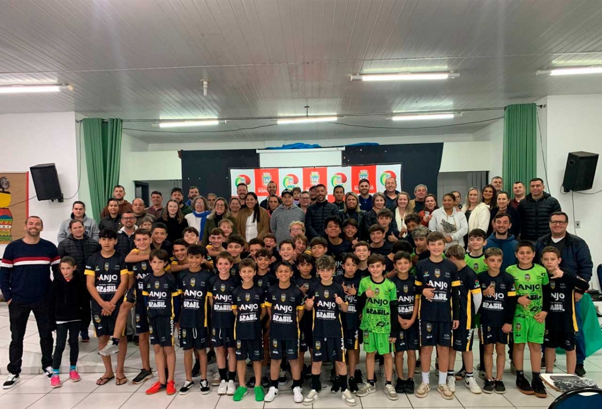 Na noite desta quarta-feira, 10 de julho, o auditório da Escola Municipal Nair Alves Bratti ficou lotado para a entrega oficial dos materiais do projeto Anjos do Futsal em Sombrio. Foram distribuídos 60 kits completos, contendo camiseta, calção e meião, além de bolas de futsal que serão utilizadas nos treinamentos da temporada.