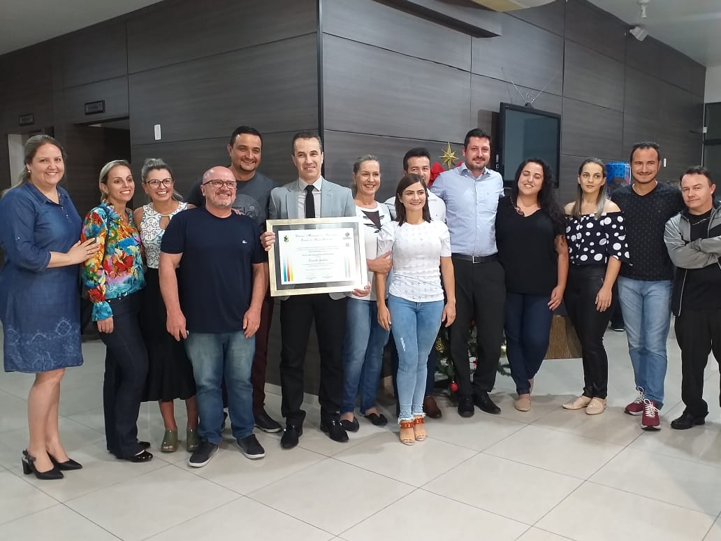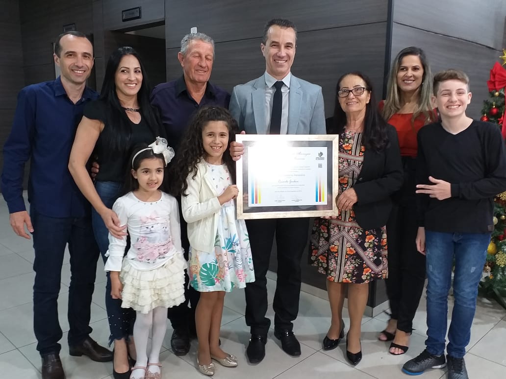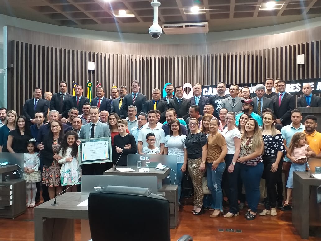 Proposta do vereador Luciano Pires (PSB) foi aprovada por unanimidade. Ghelere recebeu título com muitos aplausos