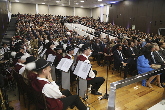 "Devemos ampliar os horizontes e pensar o Poder Judiciário não apenas para um biênio, mas para as próximas décadas". A frase é do novo presidente do Tribunal de Justiça de Santa Catarina (TJSC), desembargador Ricardo Roesler, anunciada durante seu discurso de posse nesta sexta-feira (31/1) no auditório do Tribunal Pleno, em Florianópolis. Acompanharam a sessão solene autoridades ilustres das esferas federal e estadual dos três poderes - governador, senadores, ministro do STJ, desembargadores federais e representantes de outros tribunais de justiça do país, do Ministério Público (MP) e da Ordem dos Advogados do Brasil (OAB), além de deputados e prefeitos. Músicos da banda Treml, de São Bento do Sul, embalaram os atos do evento.