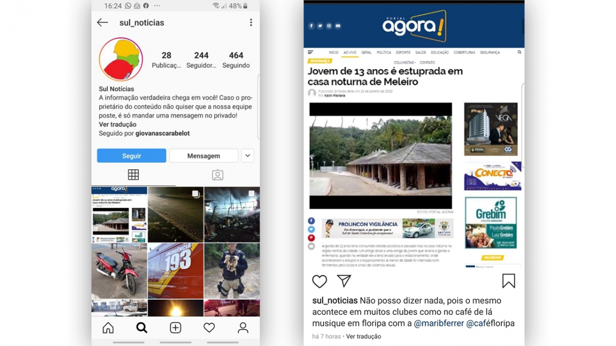 Em pesquisa na internet, a direção do Portal Agora descobriu que a Fake News tratava-se de uma montagem que utilizava trechos de uma reportagem publicada no Cidade Alerta, do dia 11 de setembro de 2012, com o título “JOVEM É ESTUPRADA POR SEGURANÇA DE CASA NOTURNA EM SANTOS (SP)“. O material foi encaminhado junto com a montagem ao delegado Bruno Sinibaldi, que investiga o caso. A direção do Portal Agora desconhece o motivo pelo qual foi feita a montagem e sua respectiva publicação no citado perfil do Instagram. Foi tentado contato com o administrador da conta sul_noticias (fake) que não retornou ao chamado. O proprietário da casa noturna de Meleiro, que também foi vítima da Fake News manteve contato com a Direção do Portal Agora informando que também procurou a delegacia de Meleiro para registrar a ocorrência e pedir celeridade às investigações. As duas empresas vítimas da Fake News agora confiam no dinamismo e na agilidade do trabalho da Polícia para apurar o crime.