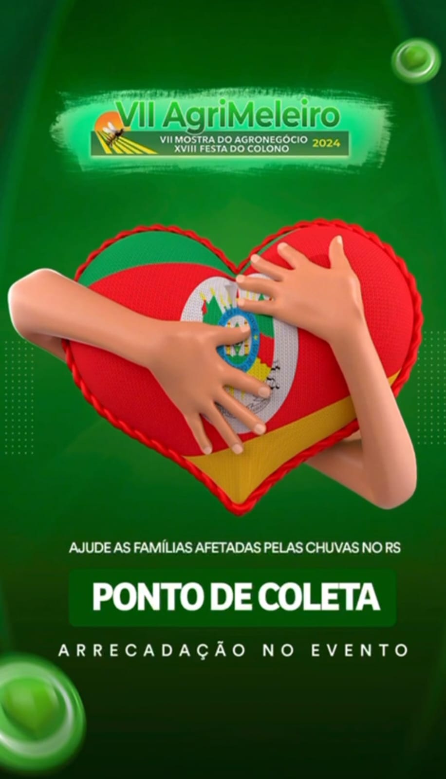 A Comissão organizadora da VII AGRIMELEIRO, juntamente com o Prefeito Eder Mattos, decidiu abrir ponto de coleta para receber donativos, como: água, alimentos nã perecíveis, roupas, roupas de cama, toalhas de banho, produtos de higiene e limpeza.