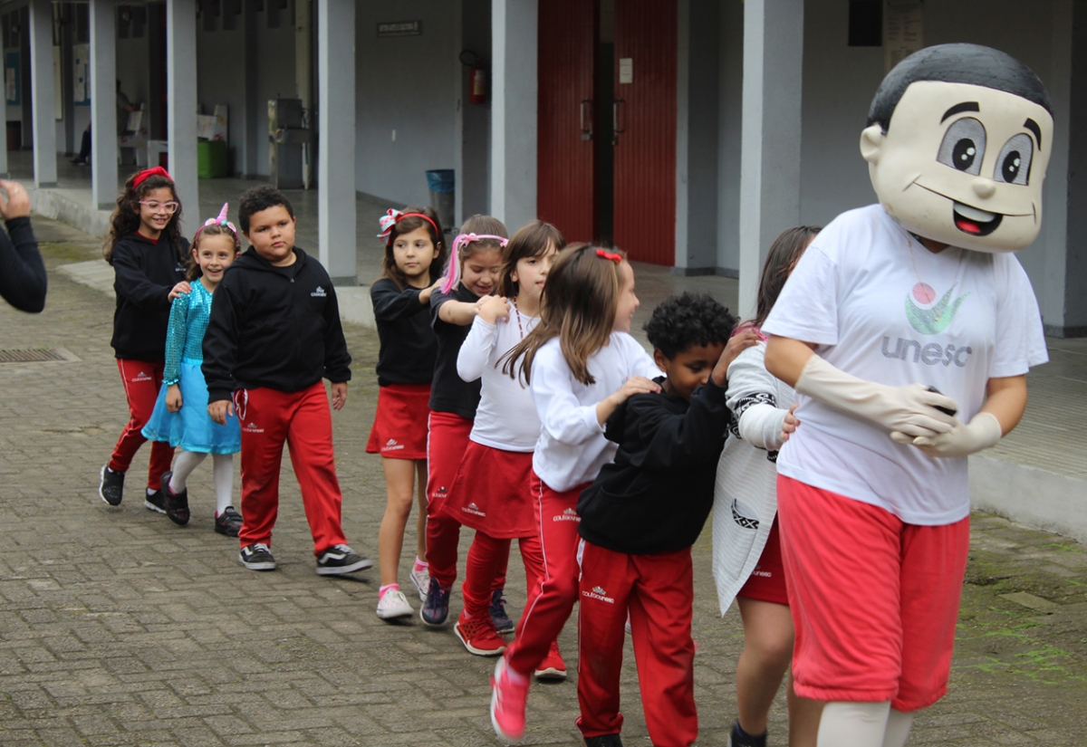 “Nossa escola é mais feliz quando você está aqui”! Estas foram as palavras que receberam os alunos do Colégio Unesc durante a volta às aulas desta segunda-feira (29). E elas não vieram sozinhas. A recepção também contou com muita música, dança, fantasia, doces, amor e carinho. A mascote do Colégio, o Unesquinho, também esteve presente durante todo o dia.