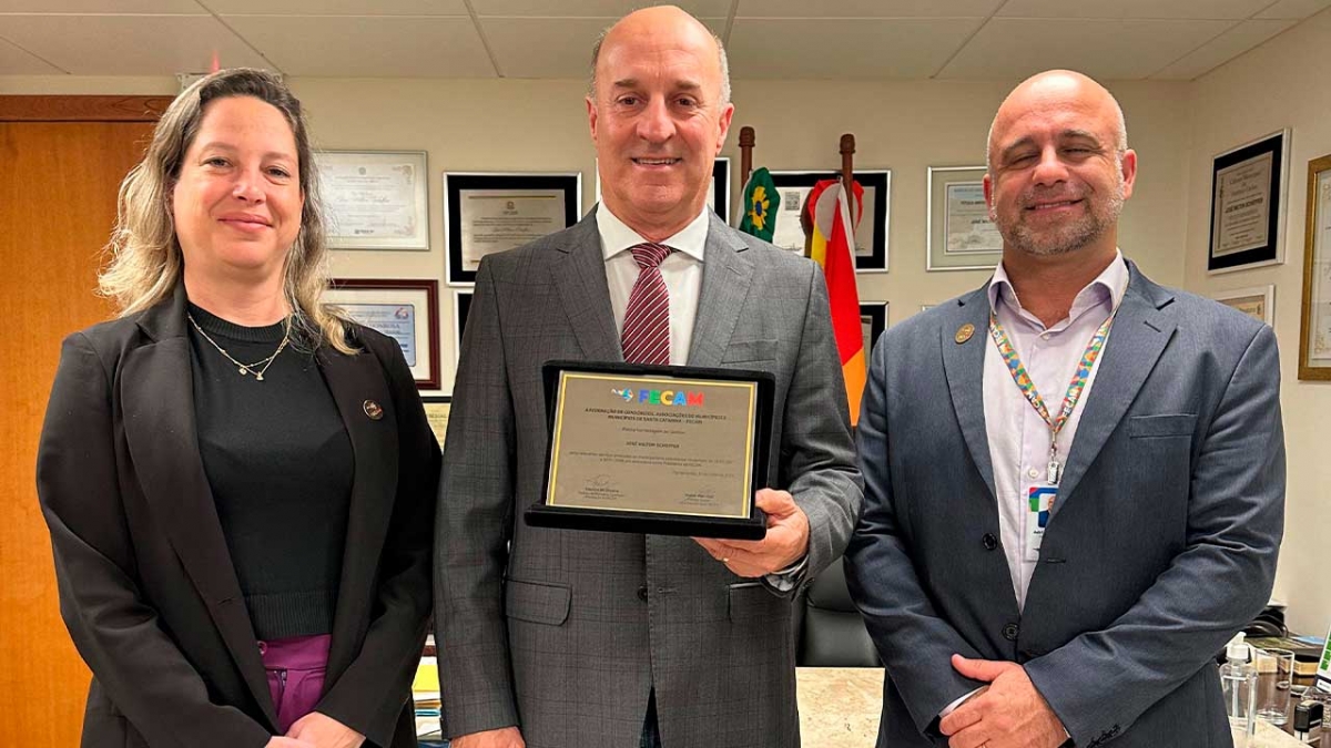 O troféu foi entregue pelo diretor executivo da FECAM, Adriano de Medeiros Caldas, e pela coordenadora de articulação institucional FECAM/ALESC, Dayana Mota, em reconhecimento ao seu compromisso com o fortalecimento dos municípios catarinenses.