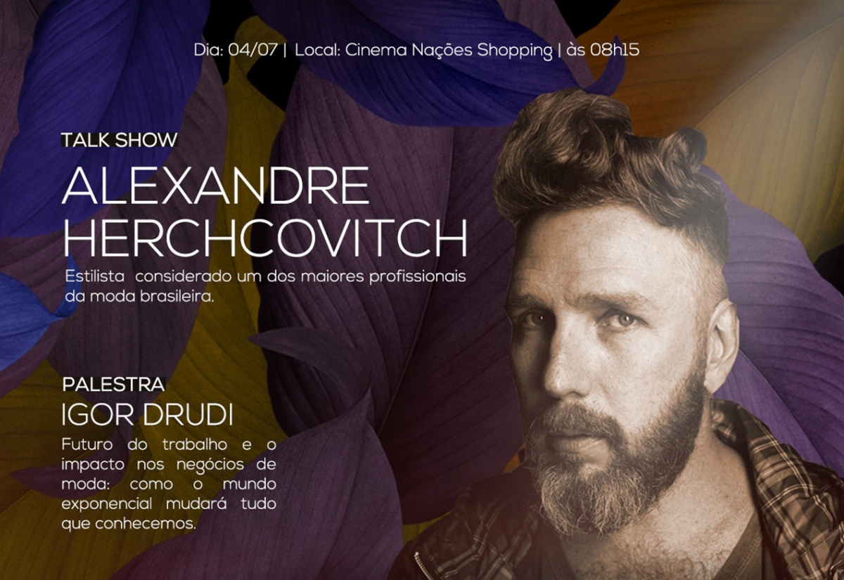 Um dos maiores profissionais da moda brasileira, o estilista Alexandre Herchcovitch, estará em Criciúma no dia 4 de julho comandando um talk show para alunos, professores e empresários da região. O evento acontece no cinema do Nações Shopping, a partir das 8h15. Ao lado do professor Igor Drudi, o evento discute o futuro do trabalho e o impacto nos negócios de moda. As vagas são limitadas a um participante por CNPJ e as inscrições podem ser feitas pelo site.