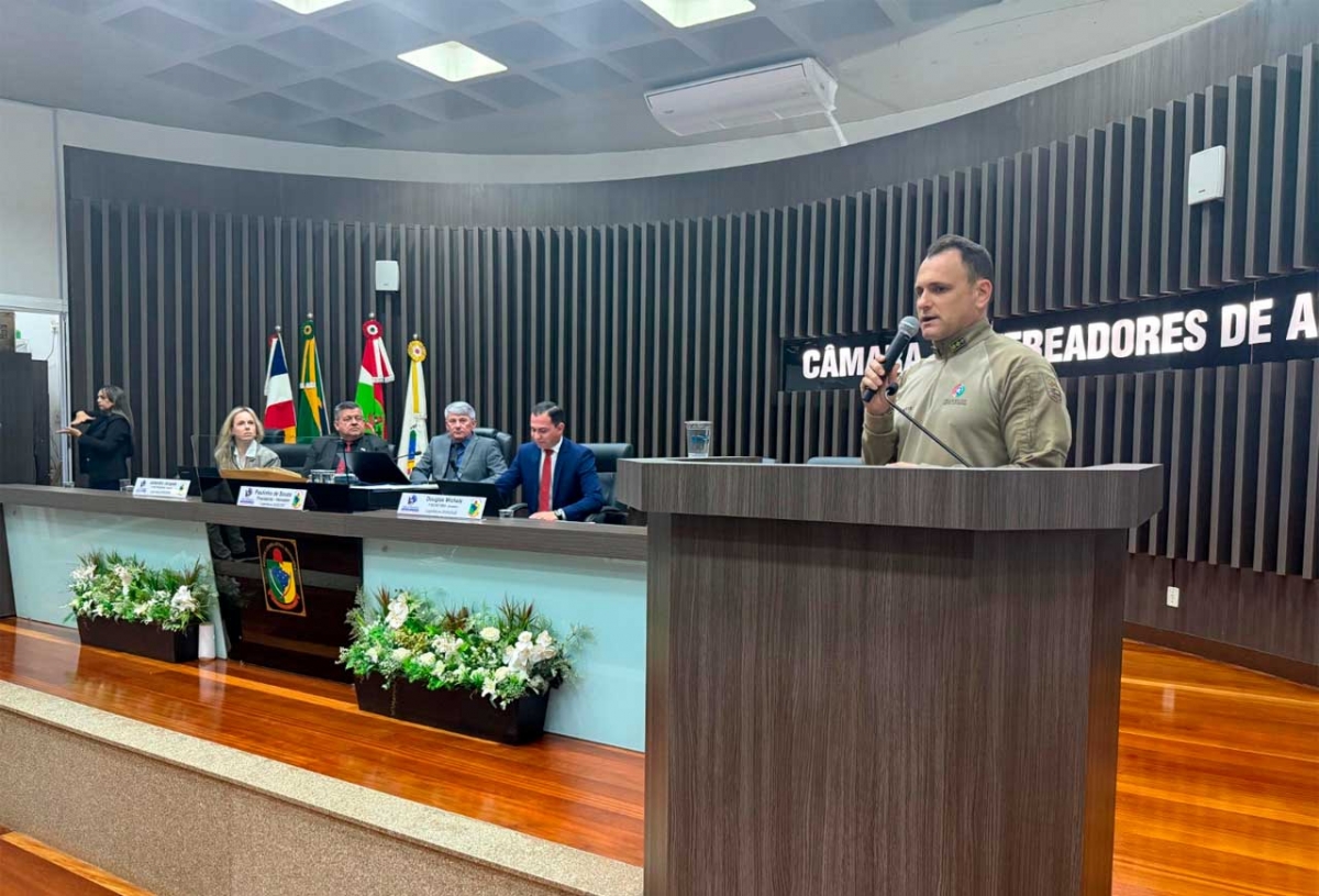 Durante a sessão ordinária desta segunda-feira (20) da Câmara de Vereadores de Araranguá, o Tenente-Coronel Marcelo Bertoncini Zanette, comandante do 19º BPM, ocupou a Tribuna para apresentar o Programa Rede Rural de Segurança, desenvolvido pela Polícia Militar de Santa Catarina. A participação atendeu ao Requerimento nº 168/2025, de autoria do vereador Douglas Michels, que destacou a importância da segurança pública no meio rural.