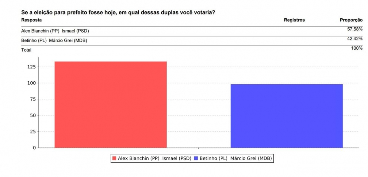 Levantamento do Instituto Sonniar, divulgado nesta segunda-feira (30), em pesquisa encomendada pela Post TV, em parceria com a TV Sul Catarinense, aponta Alex Bianchin, do Progressistas, na liderança pela disputa da prefeitura de São João do Sul.