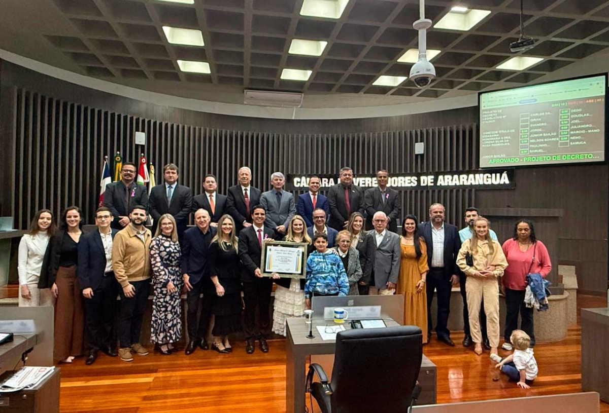 Por meio do Projeto de Decreto Legislativo nº 014/2025 de autoria do vereador Junior Bailão, a Câmara de Vereadores de Araranguá entregou, durante a 54ª sessão ordinária, o Título de Cidadania Honorária à Dra. Lorena Silva da Rosa Rodrigues. A honraria reconhece os relevantes serviços prestados pela médica ginecologista e obstetra ao município, especialmente na área da saúde da mulher, onde atua há mais de 18 anos com dedicação, competência e sensibilidade.