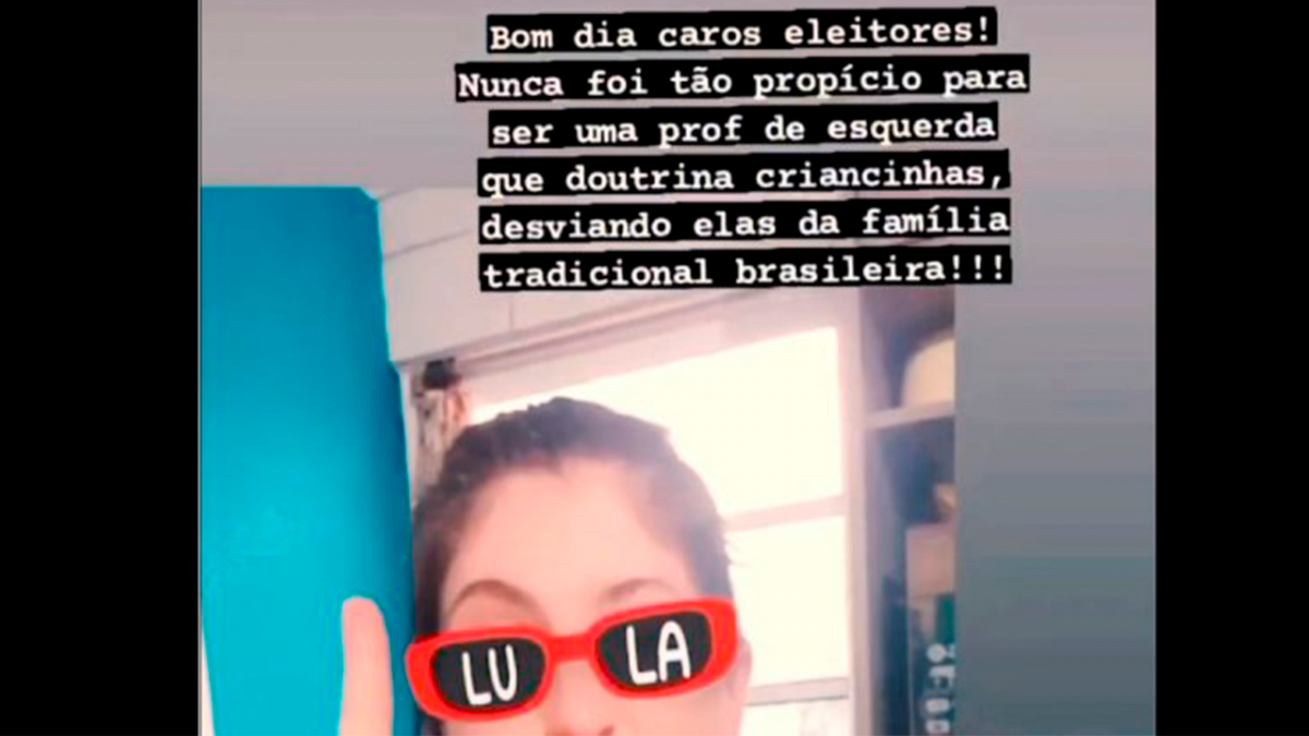 Em uma selfie onde aparece fazendo o gesto de “L” — simbolo usado pelo candidato Lula (PT) e seus simpatizantes, a professora escreveu: “Bom dia, caros eleitores! Nunca foi tão propício para ser professora de esquerda que doutrina criancinhas, desviando elas da família tradicional brasileira!”. A publicação foi realizada no dia 2 de outubro, data do primeiro turno das eleições 2022.
