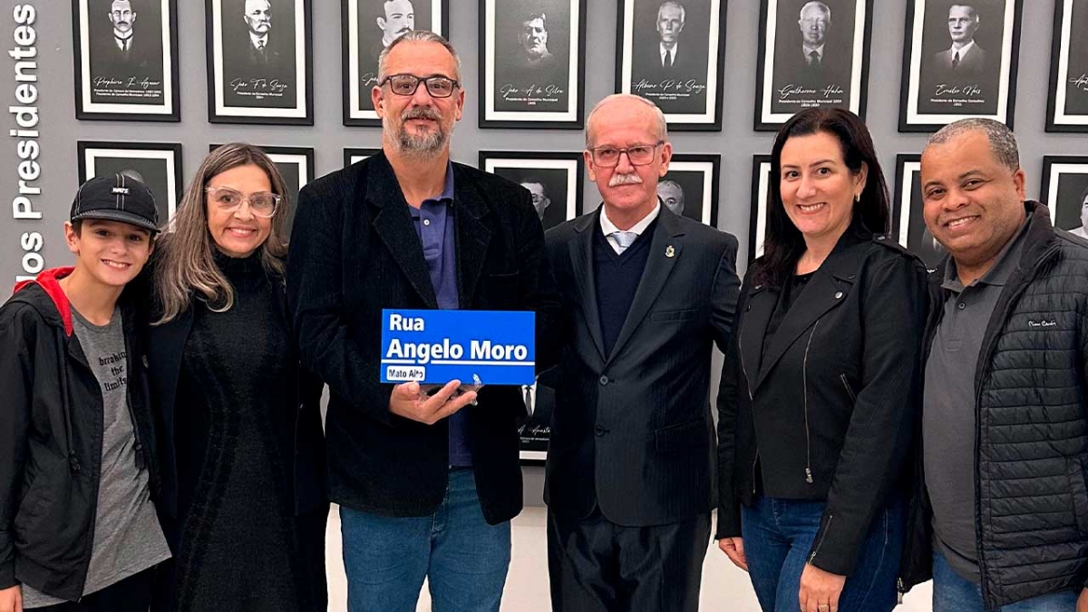 A sessão de segunda, 20, na Câmara Municipal foi marcada pela homenagem do vereador, Luiz da Farmácia, ao líder comunitário, Angelo Moro e sua família. Tudo porque, aprovou um projeto de lei de sua autoria que dá o nome "ANGELO MORO" para o trecho localizado entre a Rua Francisco José Anastácio, até a Escola de Ensino Básico Professora Julieta Aguiar Bertoncini - paralela à Rua Alameda Ascendino Mores de Sá, no bairro Mato Alto.