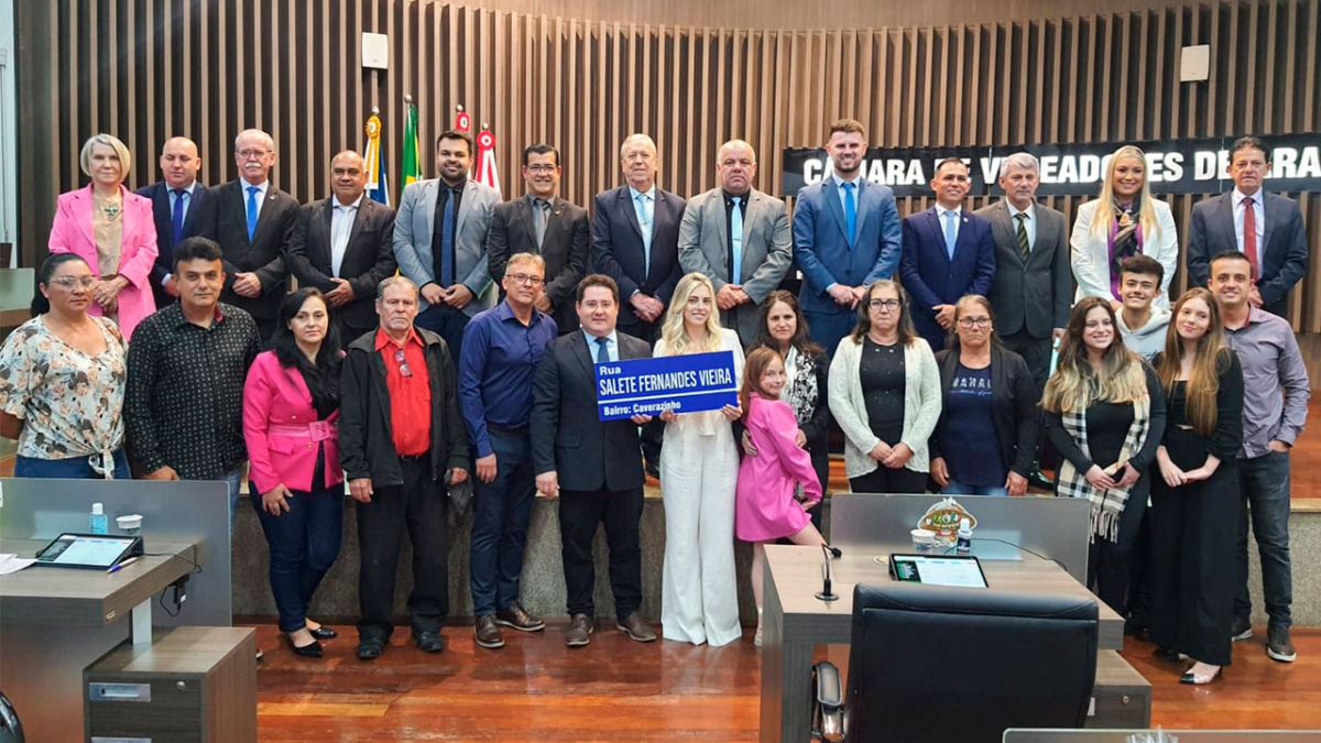 Durante a primeira sessão de novembro, realizada nesta quarta, 01, o vereador, Nelson Soares, aprovou uma lei que denominada "SALETE FERNANDES VIEIRA", a Rua "G" do loteamento residencial Santa Otília, no bairro Caverazinho. Com a presença de familiares de Salete que acompanharam a votação no plenário emocionados, uma placa indicativa que será instalada na rua também foi entregue a neta da homenageada, Cristiane Vieira.