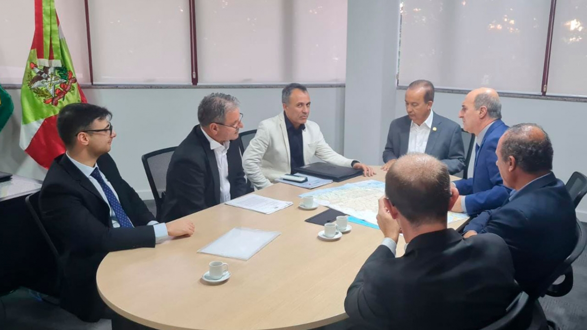 O deputado Ze Milton, o prefeito Valmir Rodrigues e o empresário Adilson Martins dando continuidade aos trabalho para a recuperação da ponte pênsil Passo de Torres , estiveram reunidos com o governador Jorginho Mello, nesta terça-feira (16), em Florianópolis.