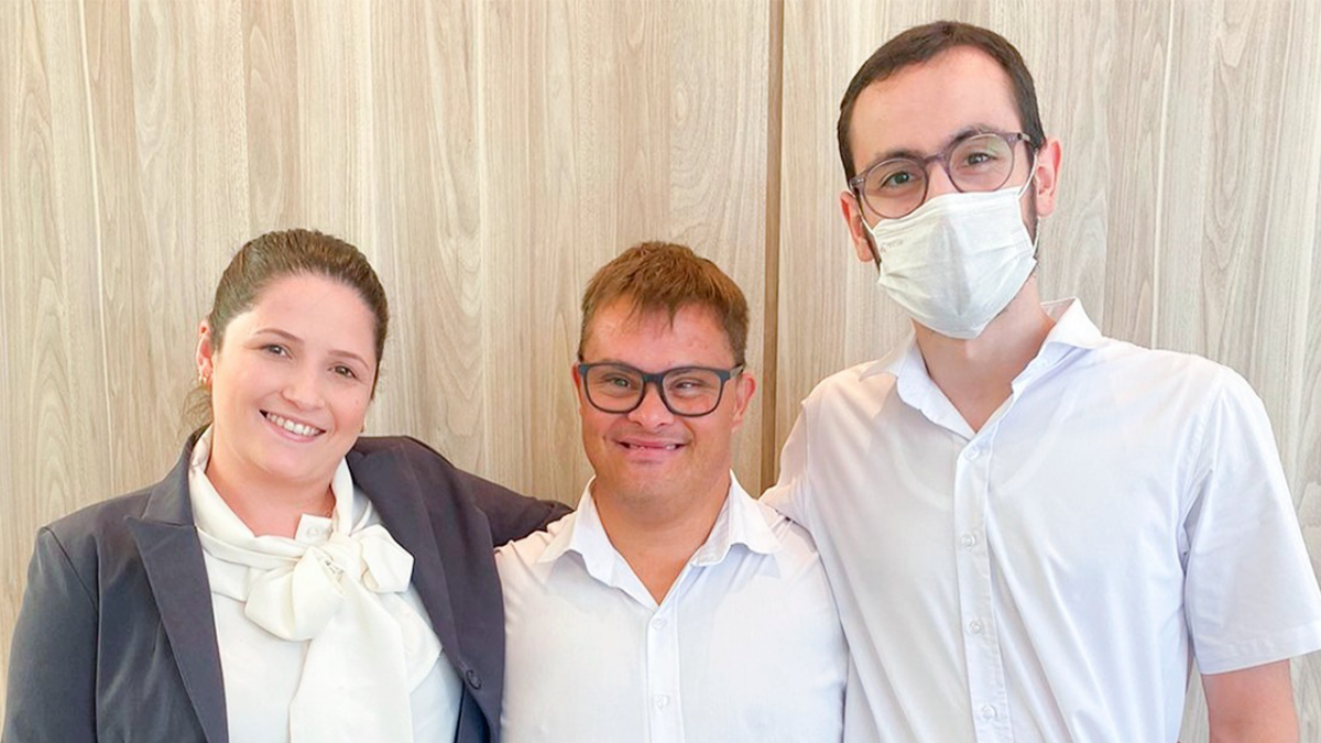 Ele tem síndrome de down, mas isso não representa nenhuma barreira ou empecilho, pelo contrário, cria uma conexão especial com os colegas de trabalho, pela energia com que desempenha suas atividades, pela satisfação de integrar o mercado de trabalho e de fazer parte de uma equipe que cresce com o aprendizado diário.