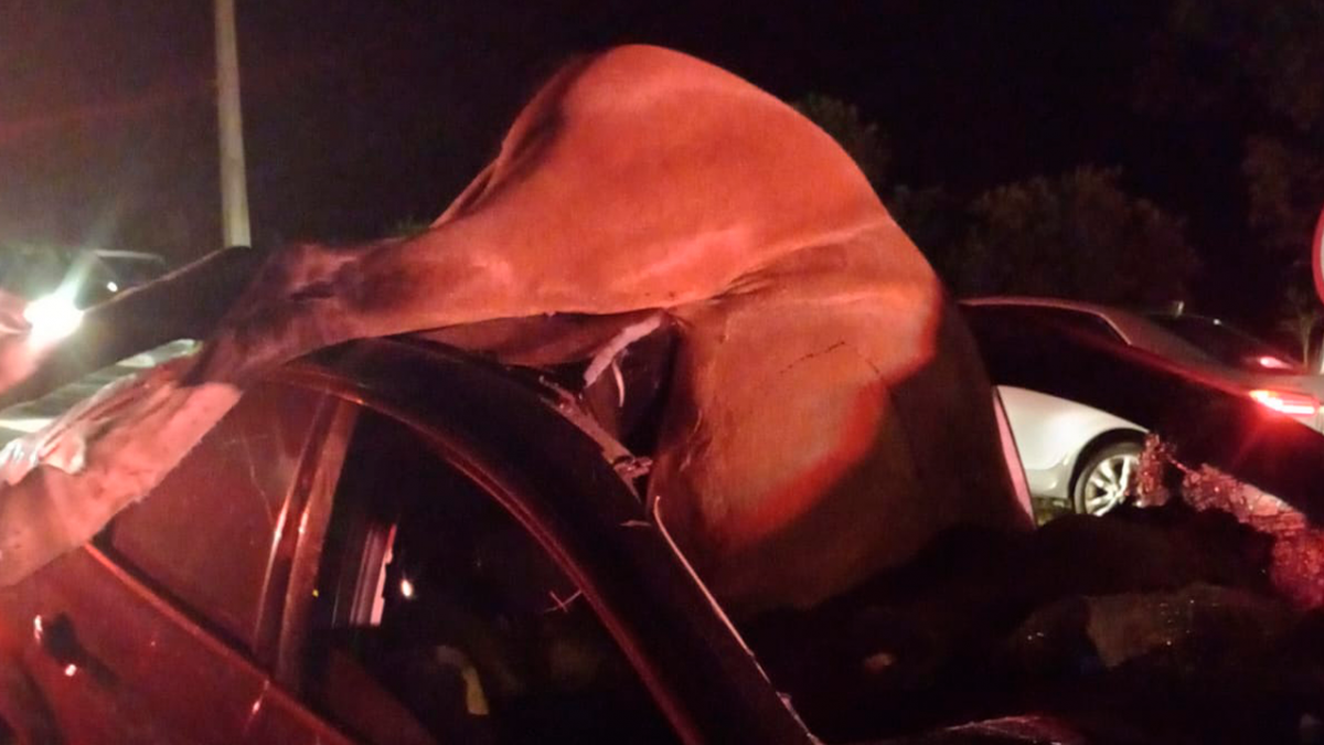 O corpo de bombeiros foi acionado na noite desta quinta-feira (9) para o atendimento de um acidente de trânsito envolvendo um automóvel e um cavalo. Ao chegar ao local, a guarnição encontrou um veículo sobre a via com a frente destruída e com um cavalo, em óbito, apoiado sobre o banco do motorista. A colisão foi frontal e cinquenta por cento do corpo do animal adentrou o habitáculo do veículo.