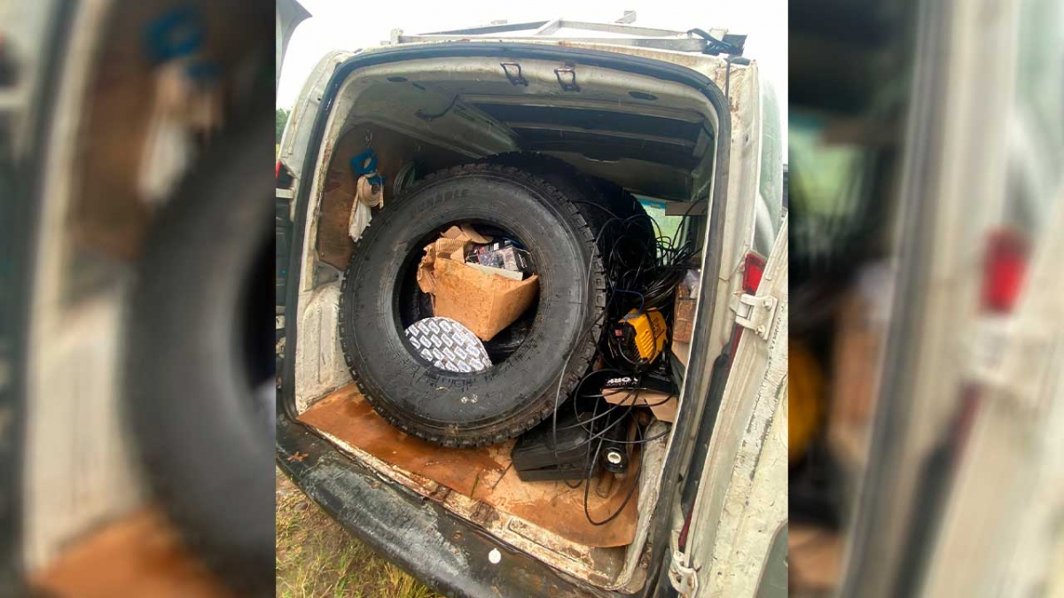 Chegando no pavilhão, foi possível localizar de baixo da mata 4 pneus de caminhão novos, 1 Esmirilhadeira, 2 furadeiras, 1 rompedor, 1 solda, 2 rolos de fios.