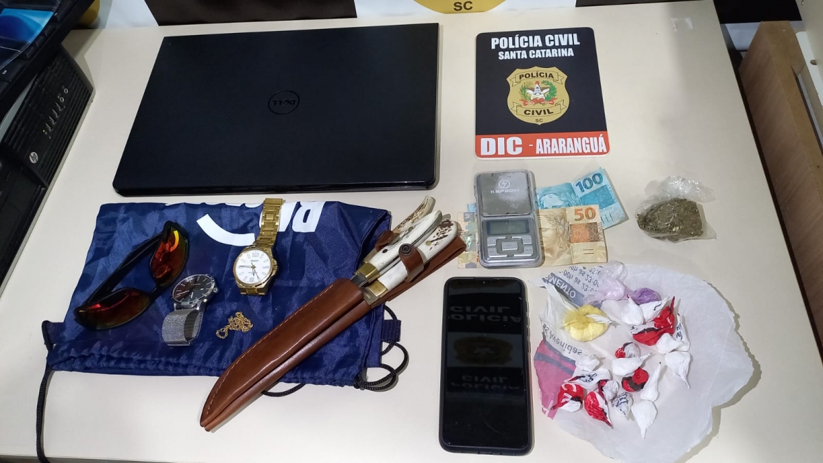 Após período de monitoramento da residência, os policiais entraram na casa e localizaram o suspeito. Durante as buscas pela propriedade foram encontrados objetos usados no crime, além de joias e um notebook roubados em estabelecimentos comerciais em Araranguá.