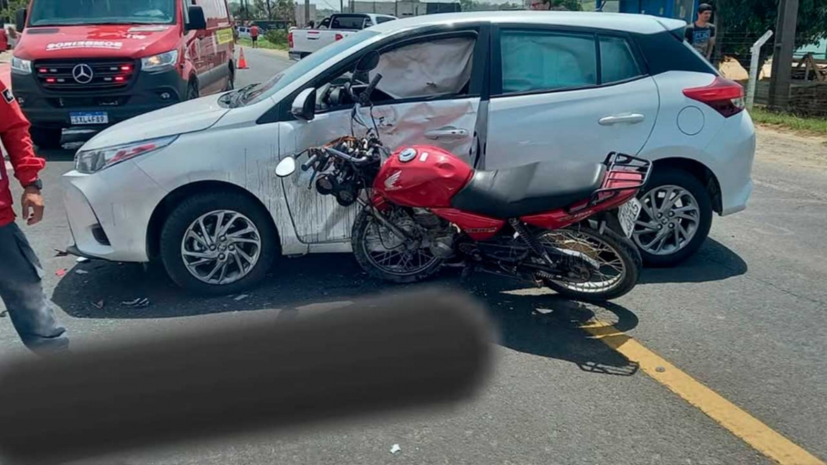 Neste sábado, 14, por volta das 12h08 a guarnição do ASU-299 foi acionada para atender ocorrência de acidente de trânsito envolvendo um carro e uma moto na rodovia SC 445, bairro Pedreiras em Balneário Rincão.
