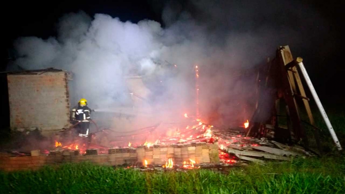 Uma guarnição do Corpo de Bombeiros Militar foi acionada para combater um incêndio em um galpao no interior de terreno no bairro Campinhoem Araranguá.