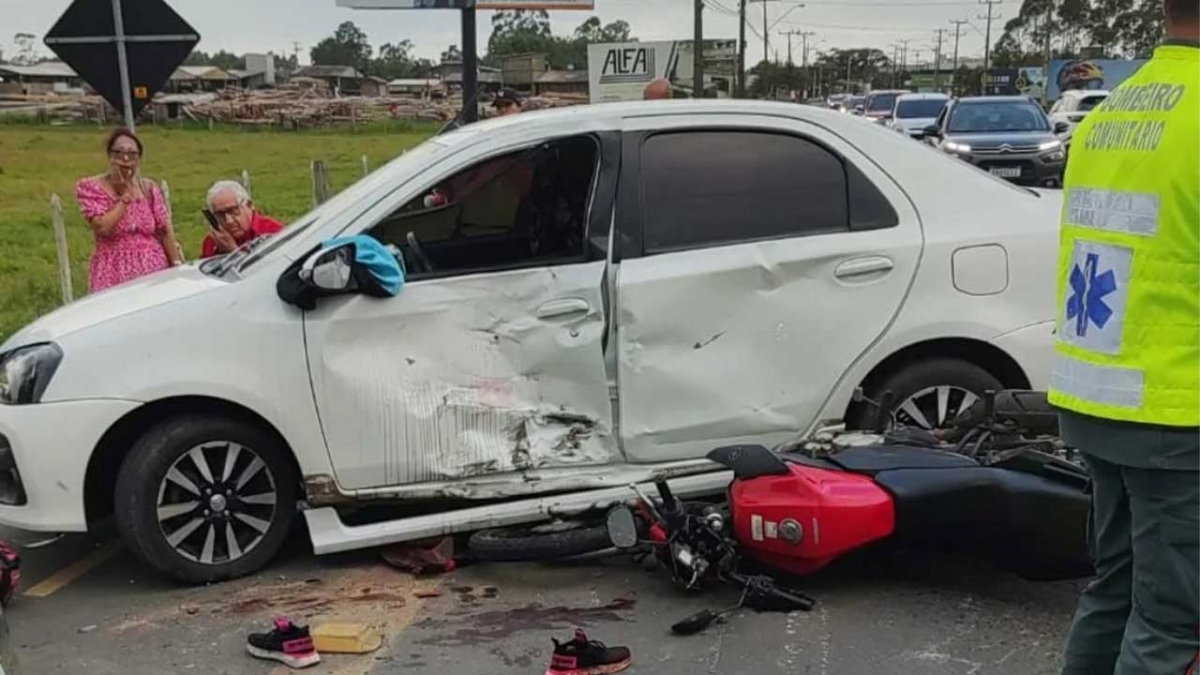 Um acidente envolvendo colisão carro x moto.