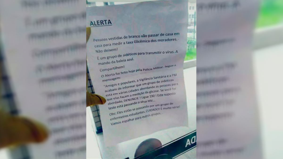 O comando do 19º Batalhão de Polícia Militar esclarece que a informação divulgada sobre pessoas vestidas de branco, realizando medições da taxa glicêmica e transmitindo o vírus HIV é falsa.
