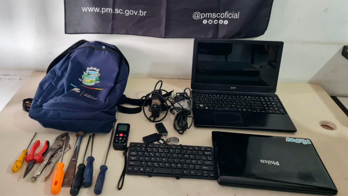 A guarnição se dirigiu até o local informado, onde eles esconderam os objetos de furto. Foi localizada uma mochila contendo dois notebooks, ferramentas, uma trena a laser, um teclado e um pen-drive. Os objetos encontrados foram mostrados para a vítima que os reconheceu.