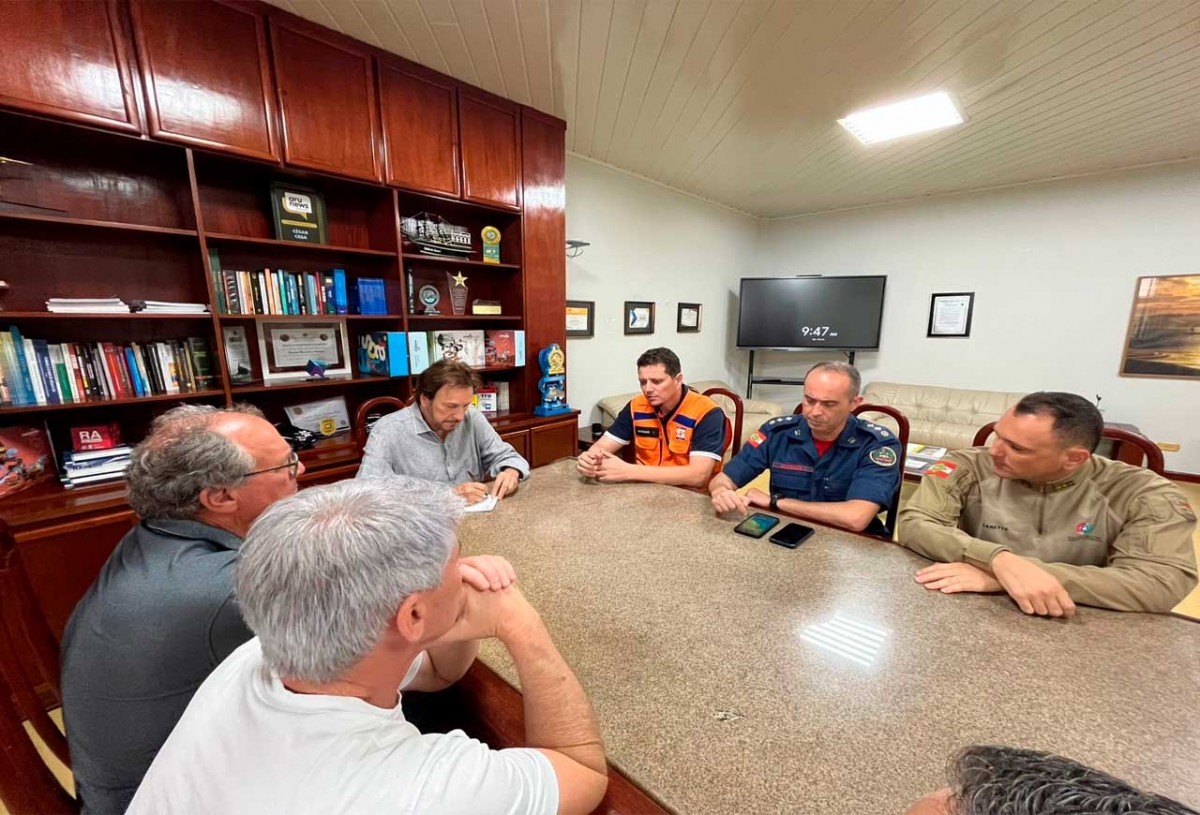 O prefeito de Araranguá, Cesar Cesa realizou na manhã desta sexta-feira, dia 7, uma reunião de alinhamento com o coordenador da Defesa Civil Municipal, Afrânio Ronconi; o comandante do 19º Batalhão da Polícia Militar, Marcelo Bertoncini Zanette; o comandante da 3ª Companhia de Bombeiros Militar, Jihorgenes Luciano Borges; o secretário de Obras, Odilon Pietsch; e o secretário de Agricultura, André Zanette.