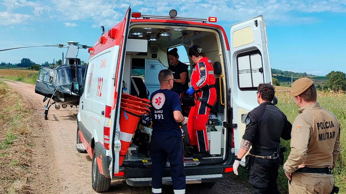 sendo realizado medicações e garantido estabilidade clínica da vítima, a seguir deslocada até o 9o Batalhão da Polícia Militar onde a Unidade de Suporte Avançado do SAMU aguardava para transferir ao Hospital São José, Criciúma.