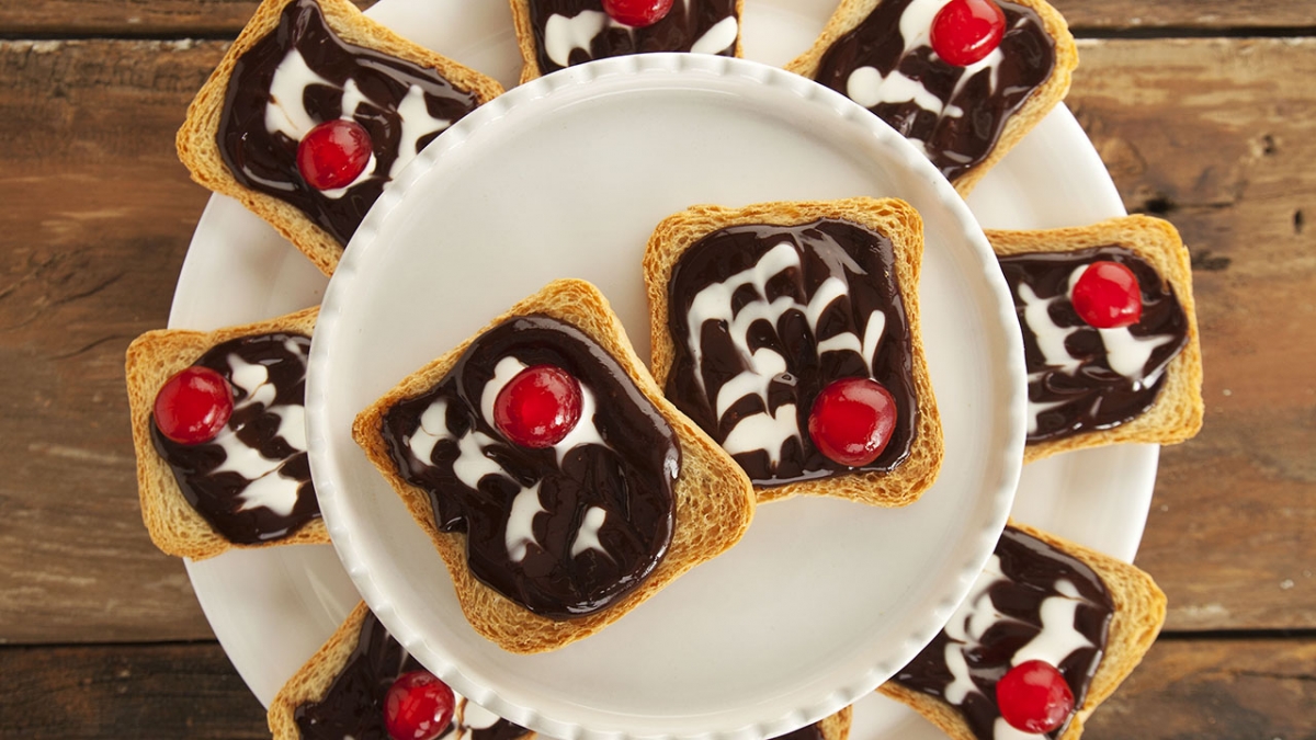 - Sobre cada torrada coloque uma porção de ganache. Despeje um fio de creme de leite e com um palito ou garfo, faça arabescos. Decore com a cereja e sirva em seguida.