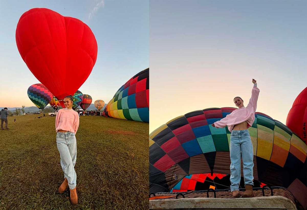 A atriz Mel Maia visitou Praia Grande, em Santa Catarina, e aproveitou atrações de ecoturismo na região. Durante um voo de balão sobre os cânions, ela presenciou o salto da paraquedista Mainara Fontanella diretamente do cesto da aeronave.