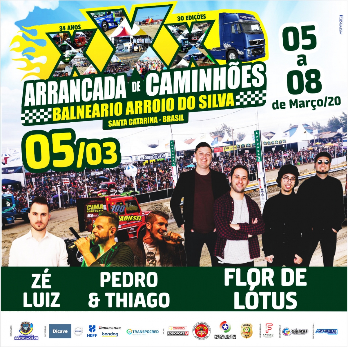 Emoção, grandes pegas e muita adrenalina. É o que promete a trigésima edição da Arrancada de Caminhões de Balneário Arroio do Silva que inicia nesta quinta-feira, 05, com shows de Zé Luiz, dupla Pedro e Thiago e Banda Flor de Lótus no palco central e encerra no domingo, 08 de março na Praia da Meta, zona norte do balneário.