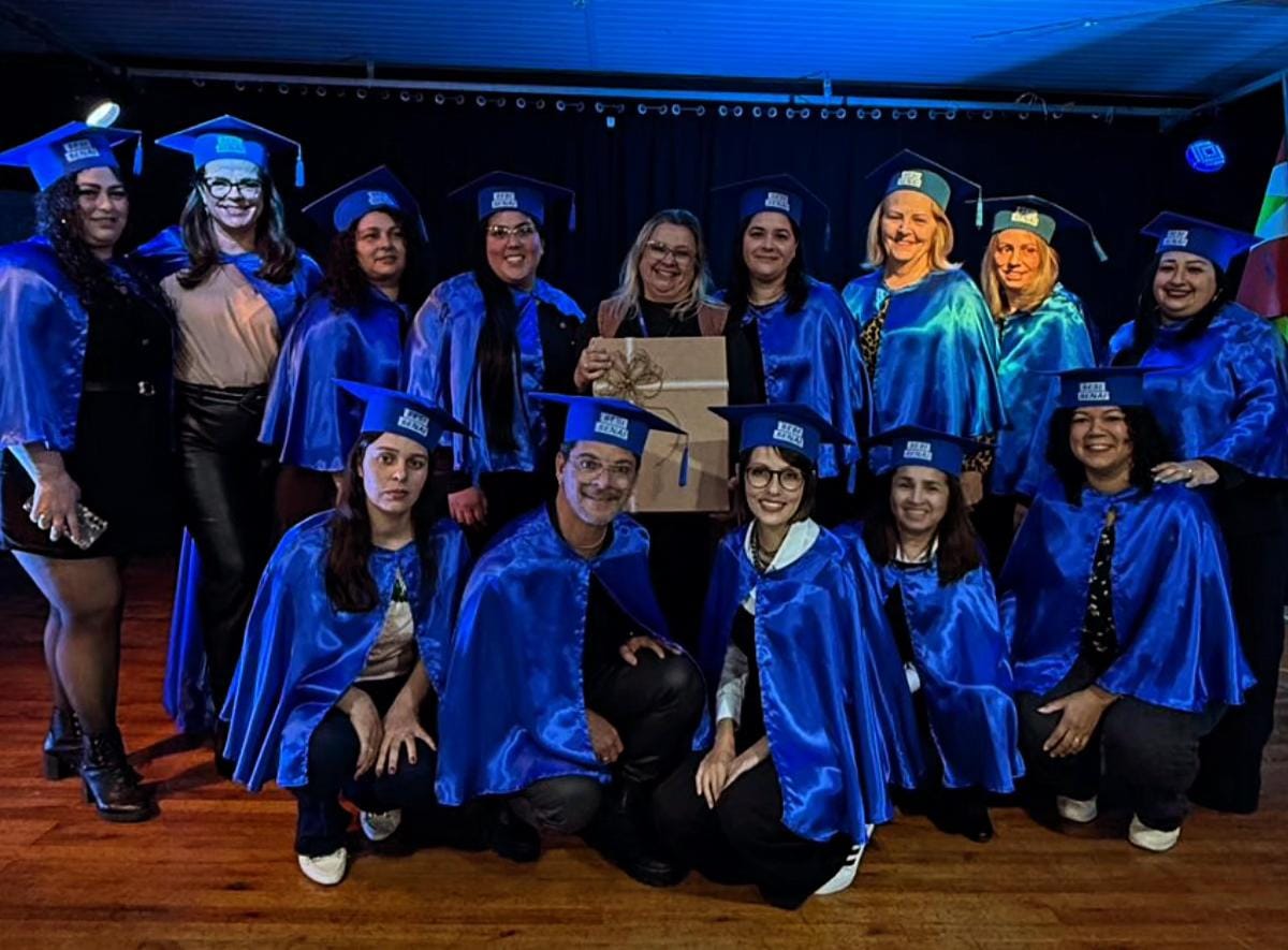 Formandos em Modelista de Roupas pelo SENAI com apoio da Casa da Fraternidade. Na foto, todos com a Professora responsável pelo curso Celene Petry.
