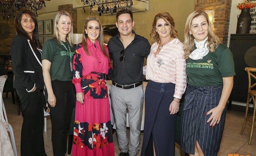 Mais de 500 pessoas, entre lideranças políticas, econômicas e da educação, a comunidade do Extremo Sul catarinense e gestores da Unesc, estiveram reunidos na última sexta-feira, dia 14, para pensar o futuro da região. O Fórum Amesc do Amanhã, realizado pela Unesc, em parceria com a Rádio Som Maior, em Turvo, chamou os participantes para refletirem e se manifestarem sobre a pergunta “Quais os caminhos para o desenvolvimento da Amesc nos próximos anos?”. Todas as considerações serão levadas ao debate entre entidades e lideranças, com o objetivo de pensar estratégias e ações que colaborem com o desenvolvimento da região. Na foto destaque para Maria Alice Aguiar, Secretária de Assistência Social e Habitação de Araranguá, Chefe de Gabinete da reitora, Gisele Coelho, empresária Katiúscia Roussenq, comunicador Juan Garcia, primeira-dama de Turvo Luci Zilli e a magnifica reitora da Unesc, Luciane Ceretta. (Foto Tudoehfesta).