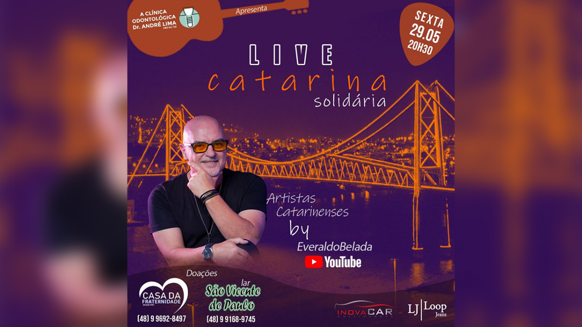 Hoje às 20h30, acontece uma live solidária, em prol da Casa da Fraternidade e do Asilo São Vicente de Paulo. LIVE CATARINA SOLIDÁRIA by Everaldo Belada terá um set list somente de artistas catarinenses com depoimentos dos músicos durante a live. Para doações durante a live serão exibidos na tela os dados bancários e para doações presenciais podem entrar em contato pelos telefones: Casa da Fraternidade 48. 99692-8497 e Asilo São Vicente de Paulo 48. 99168-9745.